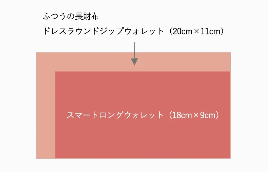 ふつうの長財布(ドレスラウンドジップウォレット)と比べてみると、スマートロングウォレットは縦と横がそれぞれ約2cmずつ小さく作られているんです。
