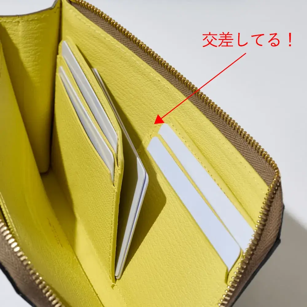 実はこれ、カードを横に並べるんじゃなくて、交差するように重ねて収納するラルコバレーノ独自の作りになっているからなんです!!めちゃくちゃ画期的ですよね〜〜!!
